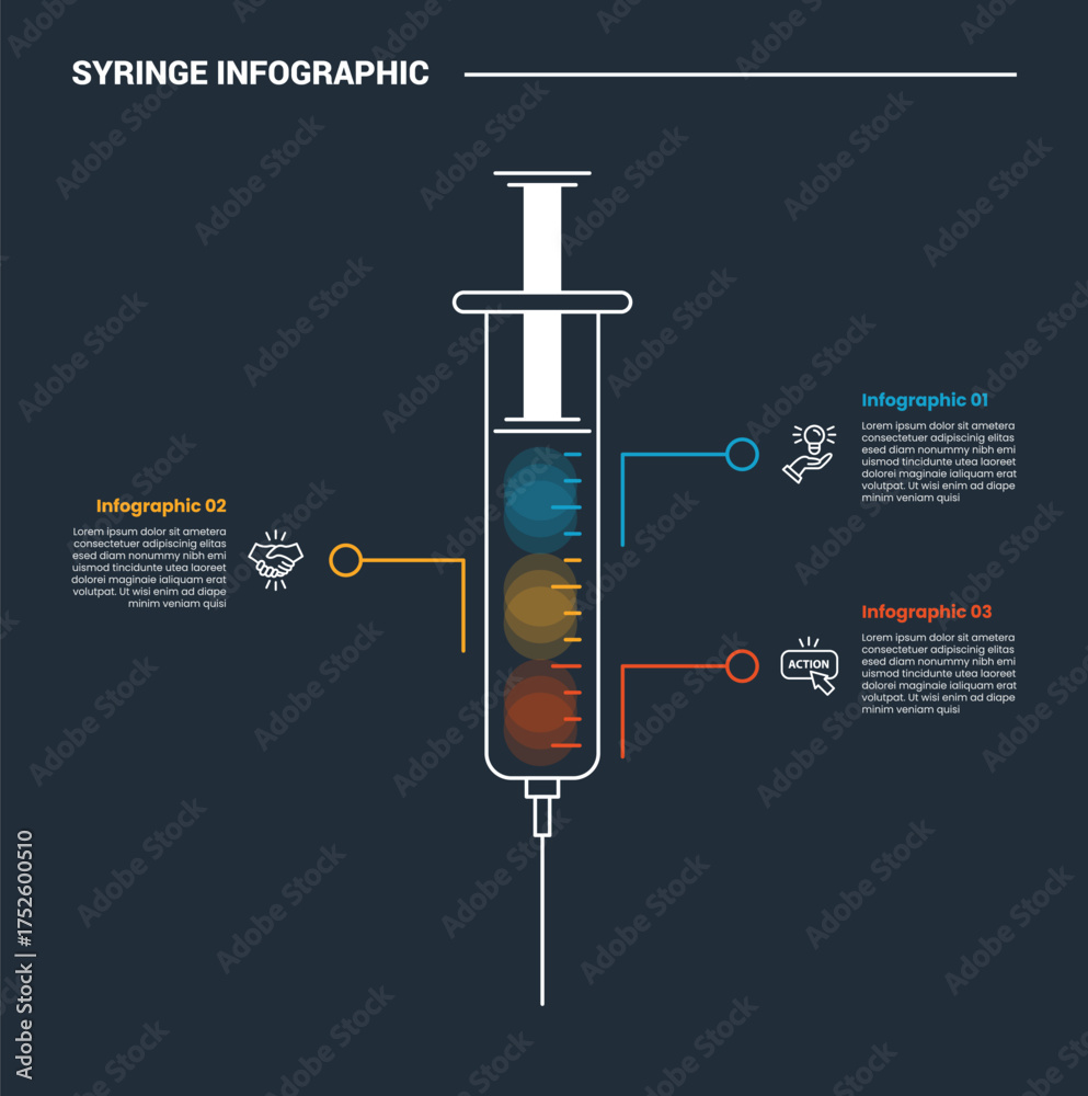 syringe medical health infographic process diagram with vertical standing with circle liquid center and opposite content with dark background bright outline style 3 points #1752600510