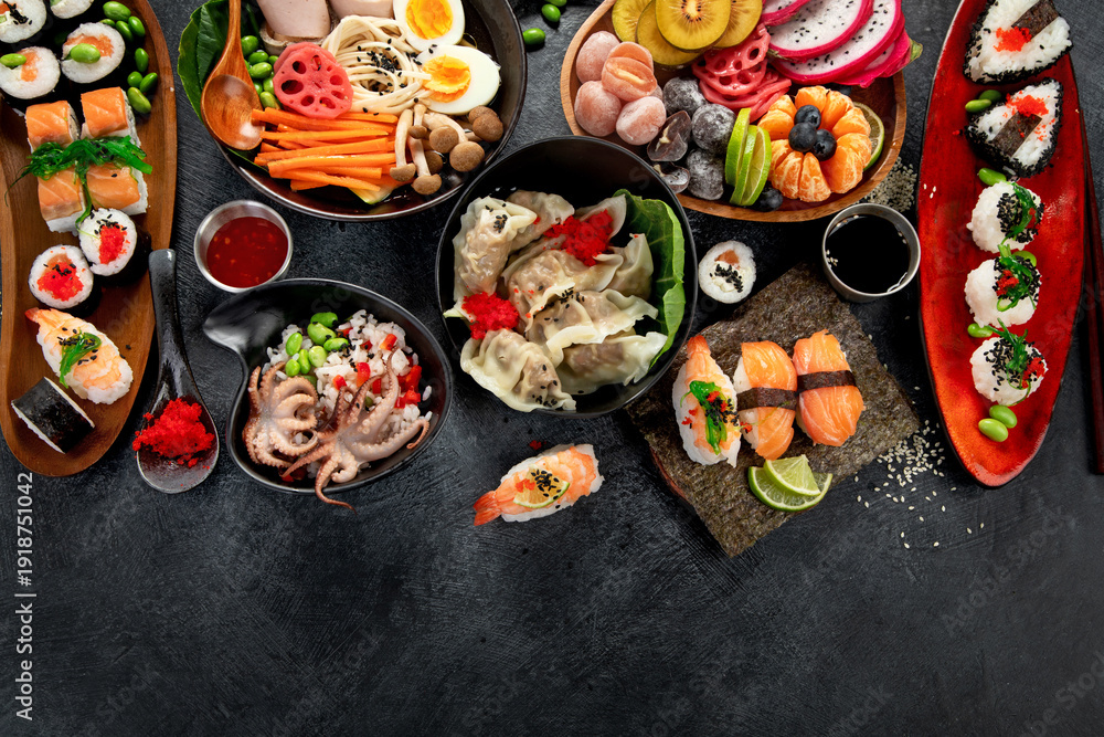 • #1941879020 A table with Asian food, sushi, rolls, desserts.