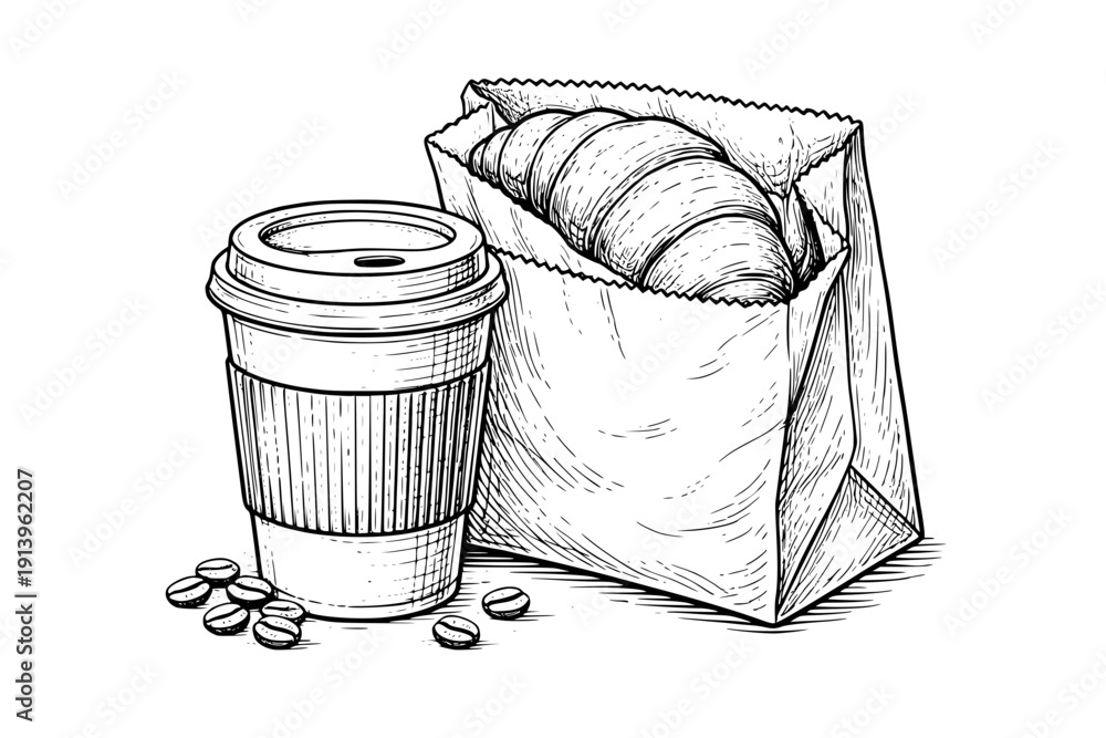 Takeaway coffee cup with croissant in paper bag, sketch style vector illustration isolated. #1913962207