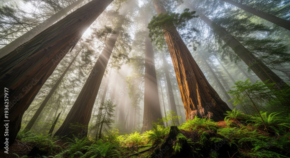 Tall trees stand in fog, creating a misty atmosphere in the forest during early morning at Sequoia National Park, California #1936257977