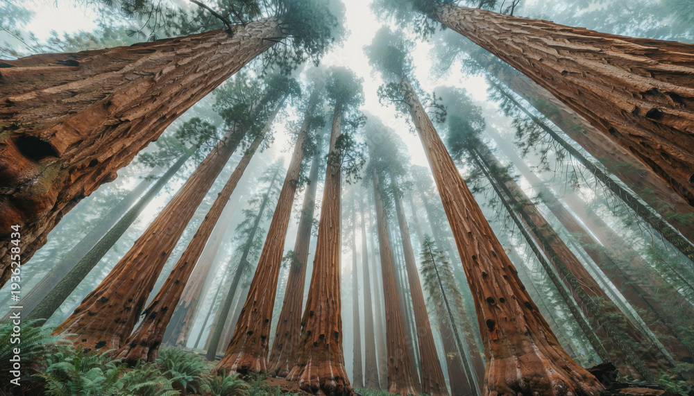 Tall trees stand in fog, creating a misty atmosphere in the forest during early morning at Sequoia National Park, California #1936258434
