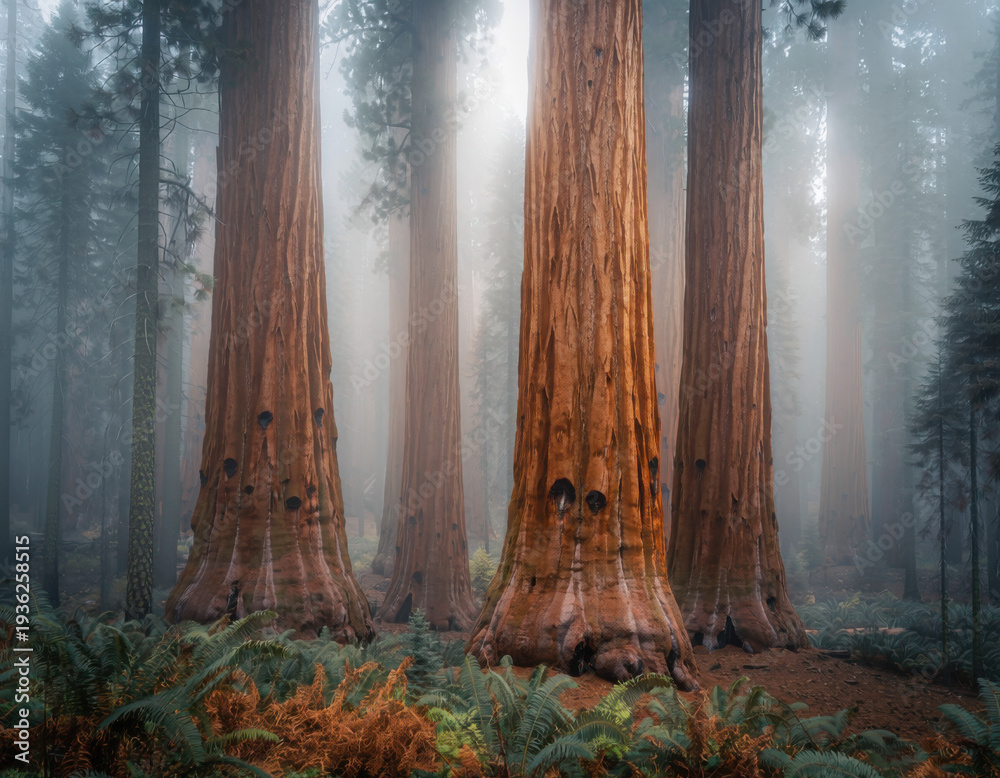 Tall trees stand in fog, creating a misty atmosphere in the forest during early morning at Sequoia National Park, California #1936258515
