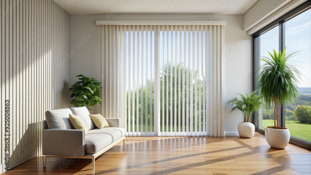 Tall, vertical window blinds with white slats filter soft, natural light, casting gentle shadows on the adjacent wall in a serene, modern interior setting. #925004863