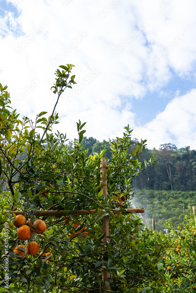 Tangerine or orange fruits ripen on lush green branches under a bright sky. Surrounded by misty mountain air and forest, the orchard bursts with color, freshness, and natural abundance. #1431148989