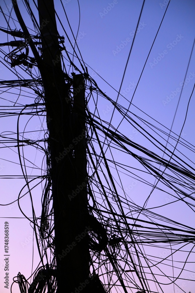 Tangled messy wires - city cables against the sky in Tirana, Albania. Utility cables, internet cables and telephone wires. #1748368519