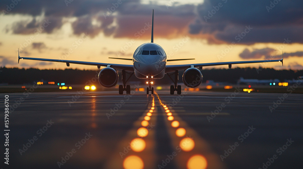 • #1942823505 Low angle close-up of runway tarmac markings and glowing taxiway edge light, airplane in background piloted by female captain during evening airport operations