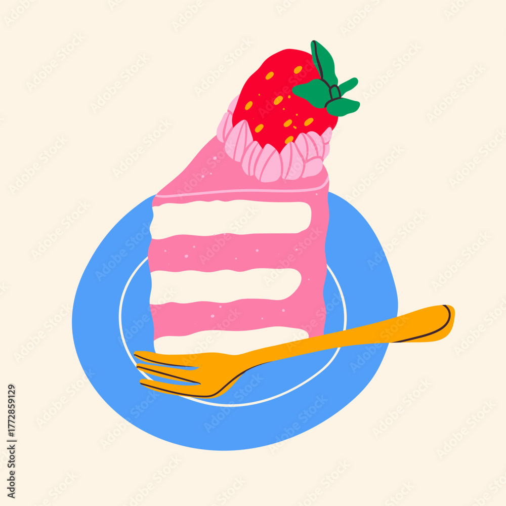 Tasty pink cake with strawberry, cream on a plate with fork. Hand drawn modern Vector illustration. Isolated design element. Summer fresh sweets concept. Logo, icon, print, poster, sticker template #1772859129