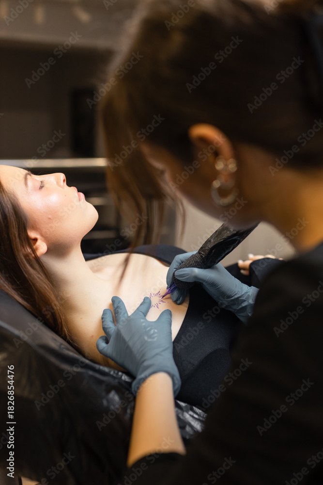 tattoo artist working on a woman chest design in a studio, showing the process of professional tattooing, precision, sterile gloves and cosmetic procedure atmosphere. #1826854476