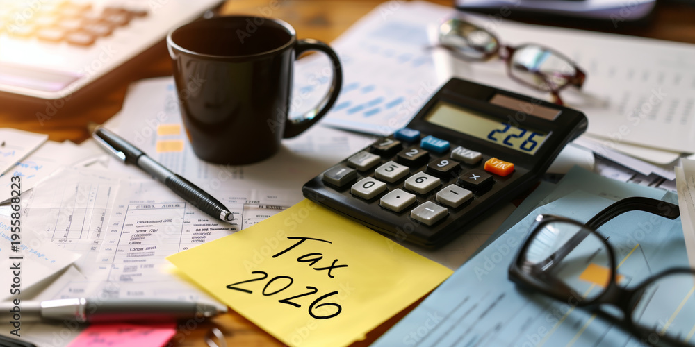 Tax documents, calculator, eyeglasses, and office supplies on a desk with a sticky note marked Tax 2026. Personal finance, tax filing, accounting, and annual declaration concept #1955868223