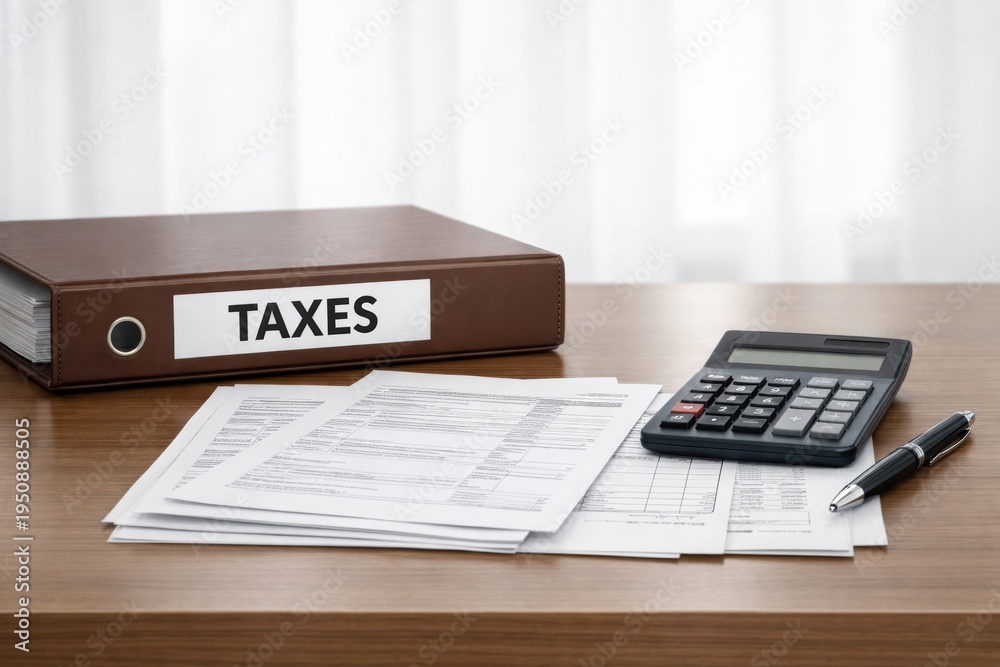 Tax Season Essentials: An overhead shot showcases the tools of the trade - the meticulously organized folder labeled 'TAXES', a calculator. #1950888505