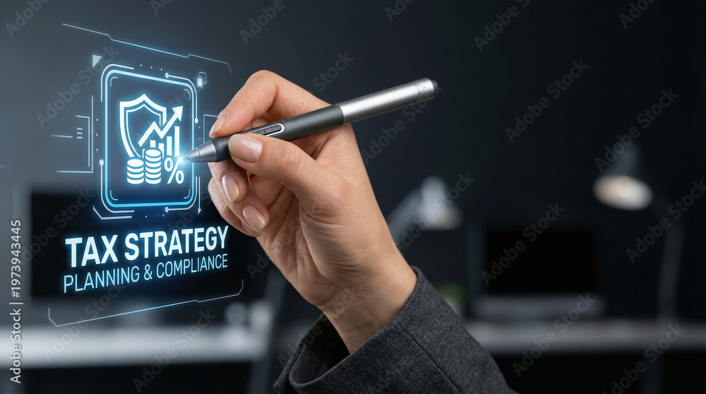 Tax strategy planning compliance high level planning hand holding pen on digital tax icon #1973943445