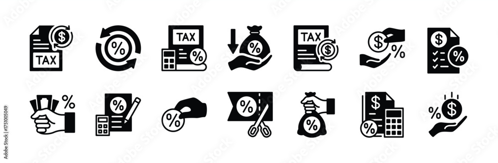 Tax, taxes and accounting icon vector set. Contains finance form, return, income, bank payment, document, calculating machine, discount, invoice, checklist, report, bill, submission. Illustration #1751005049