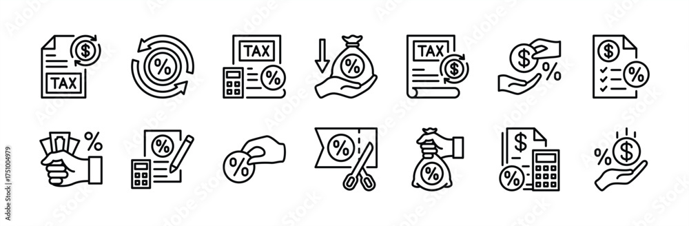 Tax, taxes and accounting thin line icon set. Finance, return, income, form, bank payment, document, calculating machine, discount, invoice, checklist, report, bill, submission - vector illustration #1751004979