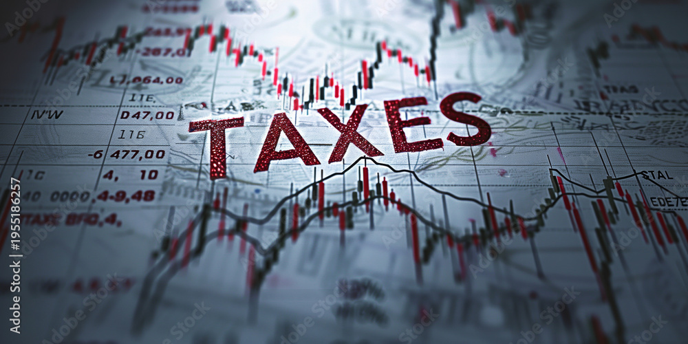 Taxes concept with the word taxes placed over financial charts, numbers, and market data. Business, accounting, fiscal policy, and tax planning theme with analytical background #1955186257