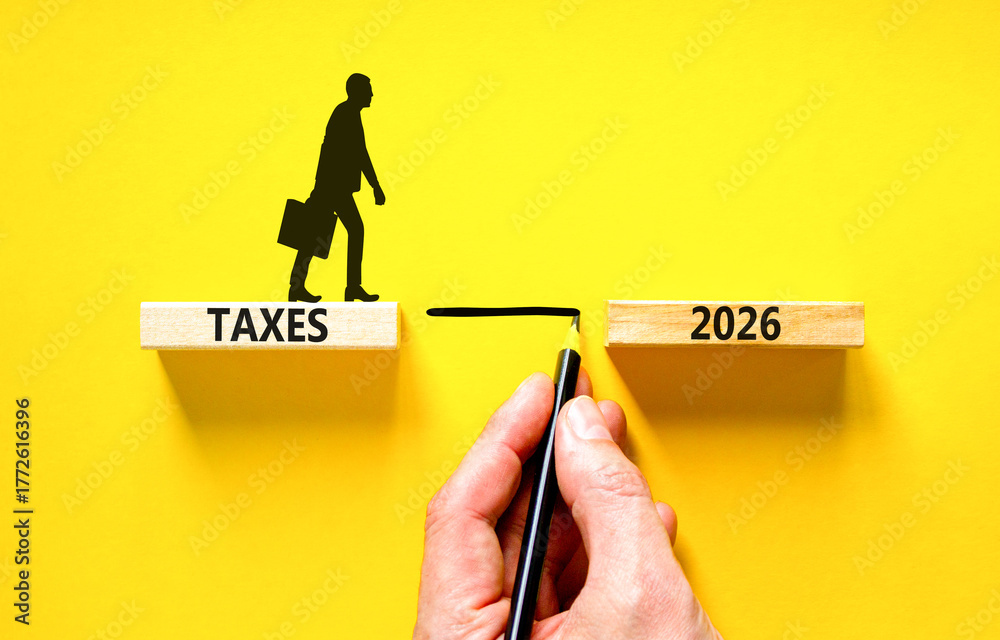 Taxes 2026 symbol. Concept words Taxes 2026 on beautiful wooden blocks. Beautiful yellow background. Businessman holds pencil. Businessman icon. Business and taxes 2026 new year concept. Copy space. #1772616396