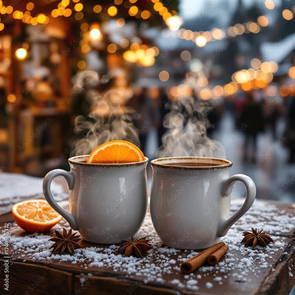Tazas humeantes de bebida caliente en un mercado navideño al atardecer #1748565372