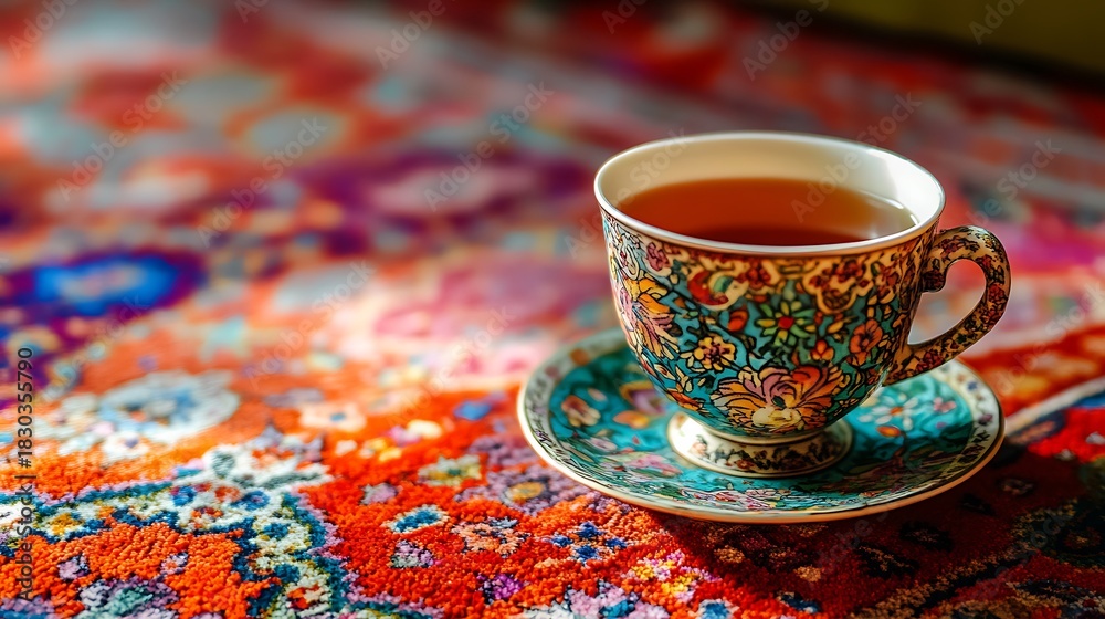 Tea cup resting on a vibrant Persian rug #1830355790