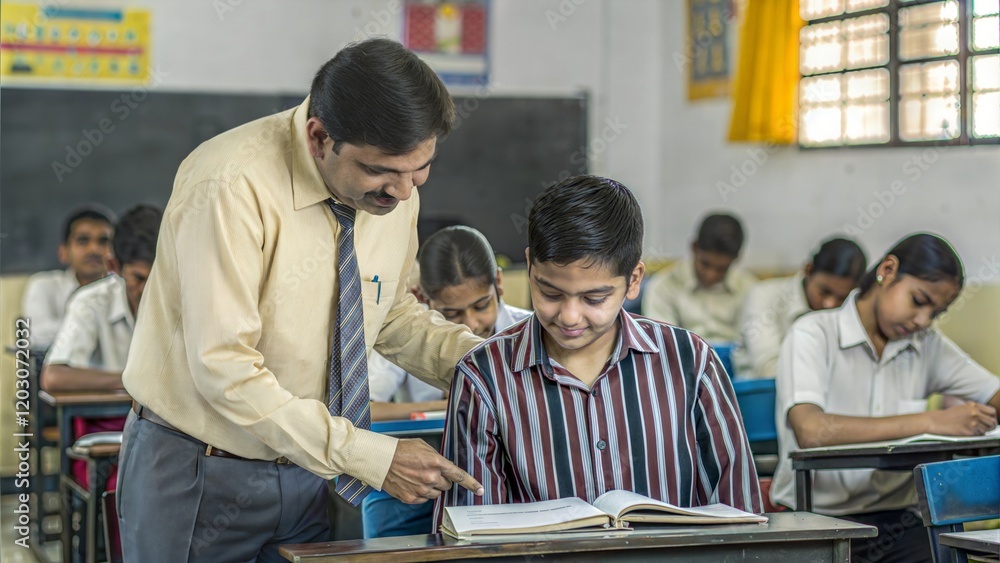 Teacher and Student Interaction : Indian teacher helping a student in a classroom setting. #1203072032