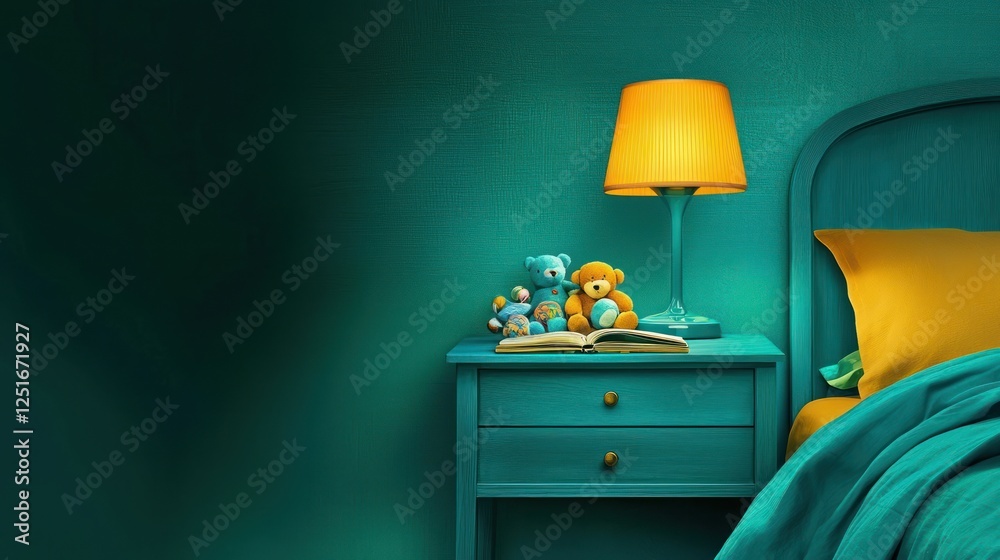 Teal bedroom nightstand with teddy bears, book, and lamp #1251671927