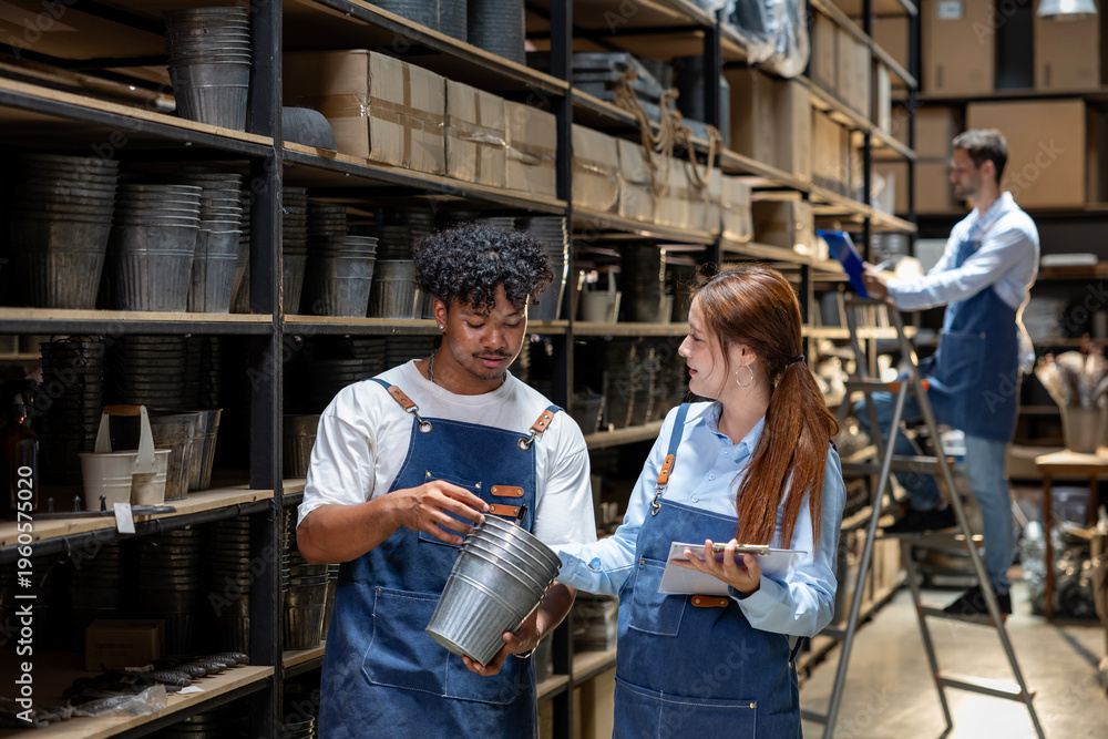 Team of warehouse workers having discussion while checking the storage stock for inventory and merchandise in distribution and shipping logistic center concept #1960575020