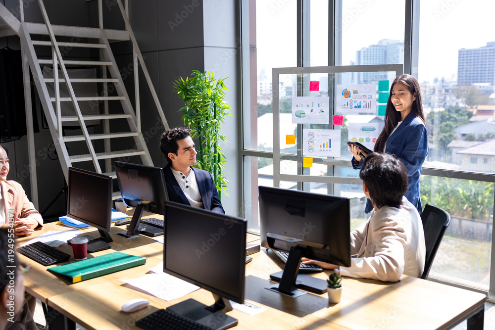 Team of young asian entrepreneur have small team meeting for project for marketing and sale management with skyscraper view for business startup and education usage #1949554871