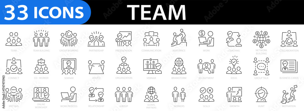 Team Web 33 line icon set. 33 outline icons related to team. Teamwork Linear Icons, Including team building, workshop, human resources, group, coaching, collaboration and more. Vector illustration #1767475963