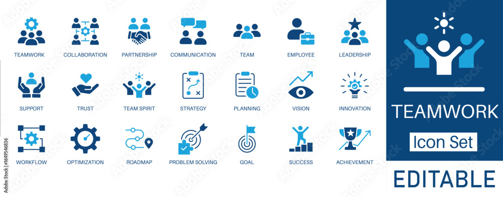 Teamwork and Collaboration solid icon set. Contains symbols for business partnership, strategy, success, and management. Flat vector design for corporate presentations and workflow. #1649546836