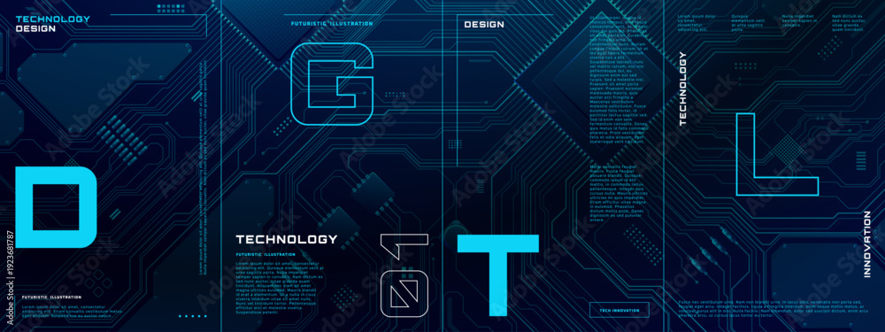 Tech circuit board background with glowing blue lines and AI data patterns. Digital template for modern business presentations, posters, and corporate brochures. Vector illustration #1923681787