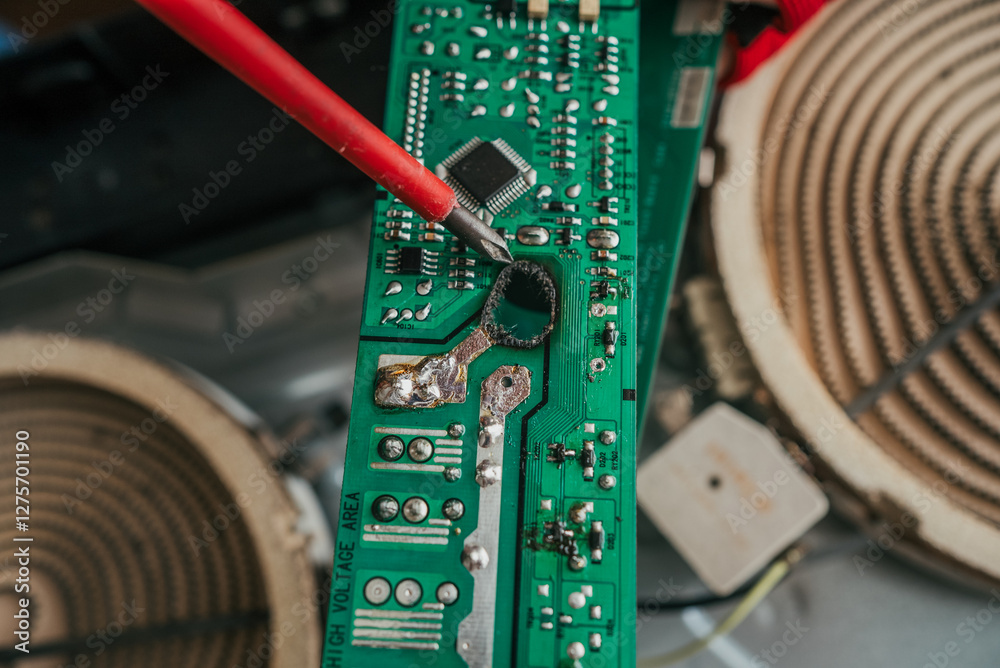 Technician closely examining burnt electronic circuit board, revealing intricate damage and potential electrical risks during detailed repair investigation of kitchen appliance components #1275701190