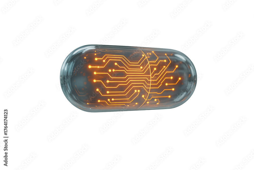 Technological marvel in a pill form: A close-up view unveils a futuristic capsule, intricately embedded with a microchip, epitomizing technological advancement. #1764174123