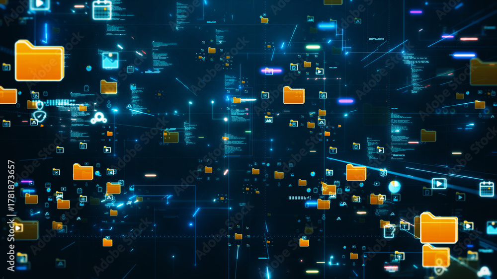technology futuristic digital network visual showing glowing file folders and data icons floating in cyberspace, symbolizing data storage, file sharing, and cloud computing. #1781873657