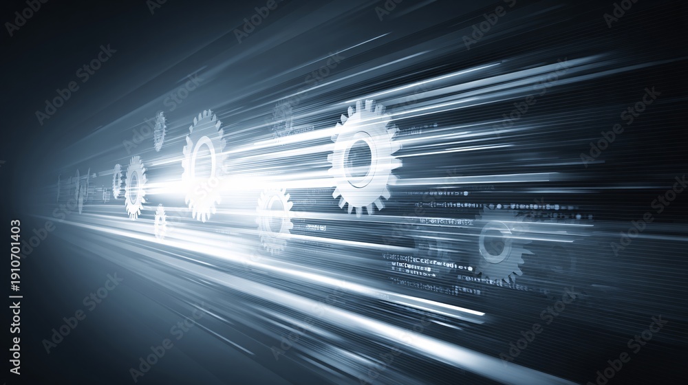 technology illustration showing digital gears powered by flowing code symbols, representing agentic AI systems, automation logic and machine learning processes, futuristic business transformation #1910701403