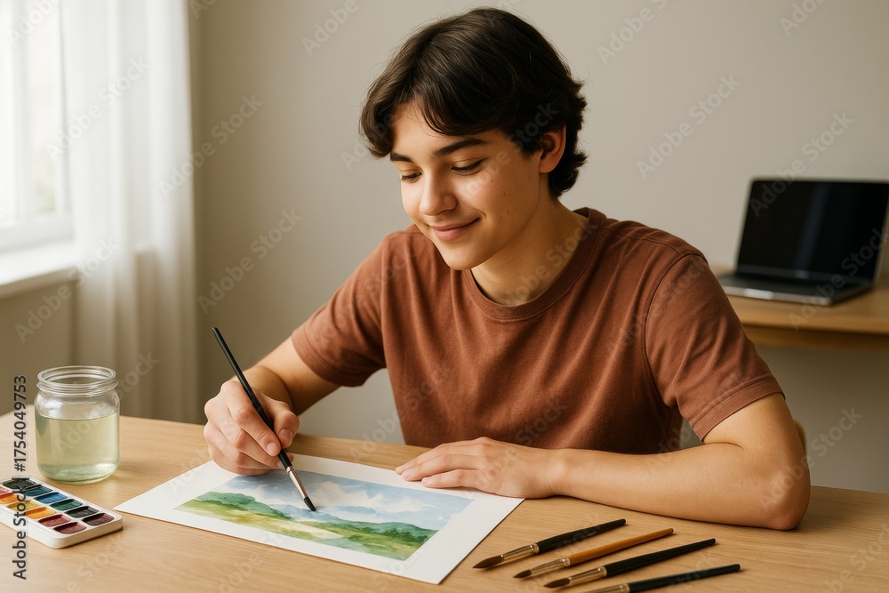 Teen enjoying watercolor painting indoors while smiling calmly in natural light with art tools on wooden desk in cozy modern lifestyle setting. Ai generative #1754049753