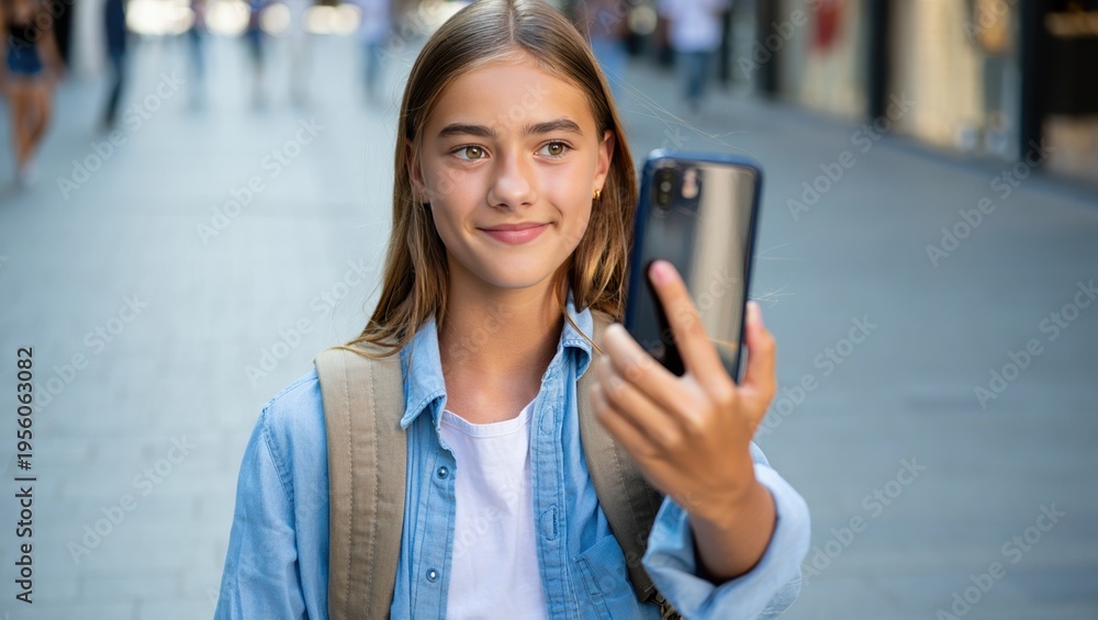 Teen girl posting travel story on smartphone while walking along busy street #1956063082