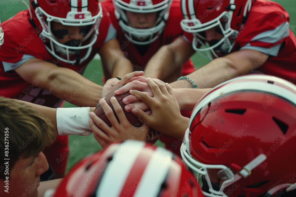 • #836271056 Teenage boy high school football team connecting hands in huddle. High Details, 8k, UHD