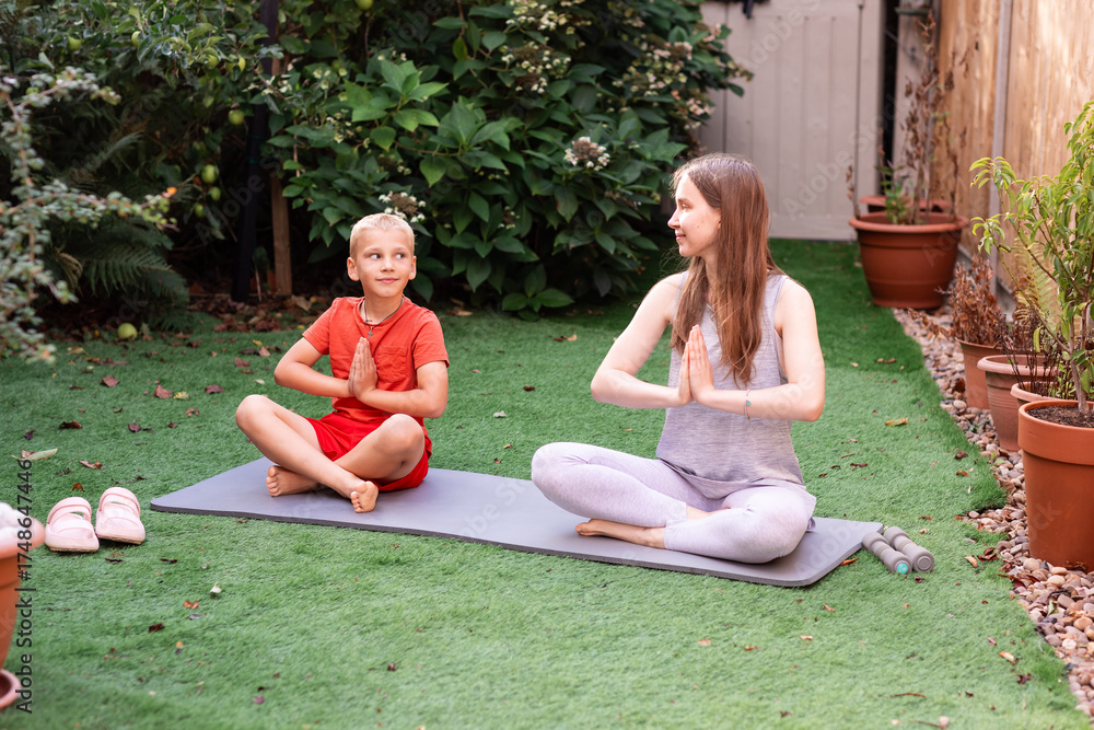 Teenage Girl and Boy Doing Yoga Together in Backyard. Family Fitness, Healthy Lifestyle #1748647446