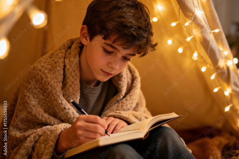 Teenager wrapped in soft blanket writing in diary, warm garlands and cozy atmosphere, emotional comfort, natural pose, mental health recovery concept, peaceful mindful moment #1755656933