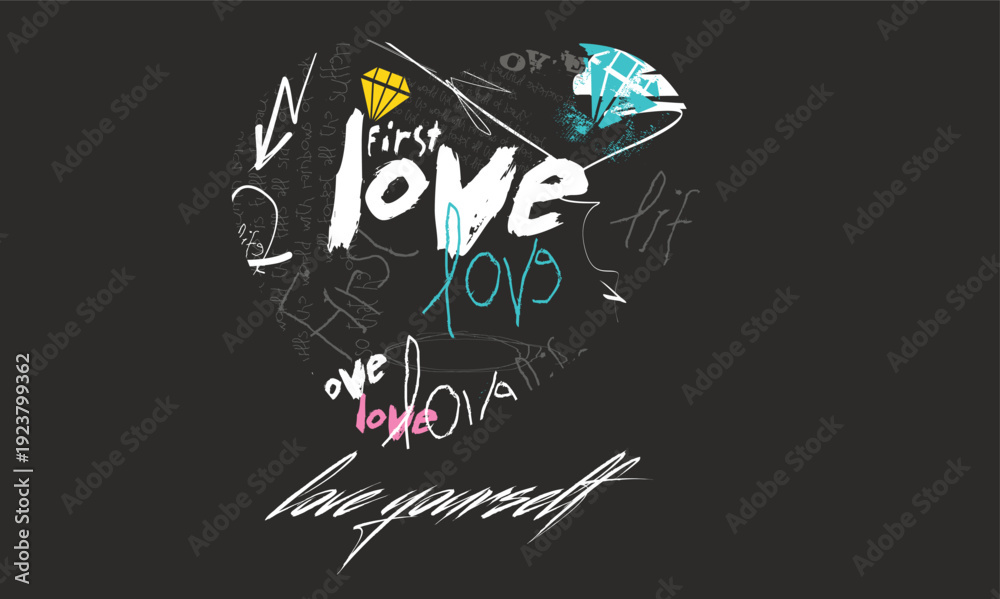 tees art, writing love graffiti, love yourself slogan grunge effect slogan Calligraphy, grunge LOVE urban style quote typography. Urban graffiti typography slogan print, Tees graphics print.eps #1923799362
