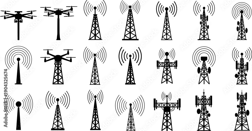 Telecommunication tower and drone silhouette icon set wireless signal antenna network broadcasting technology communication infrastructure black vector illustration isolated white background #1904325674