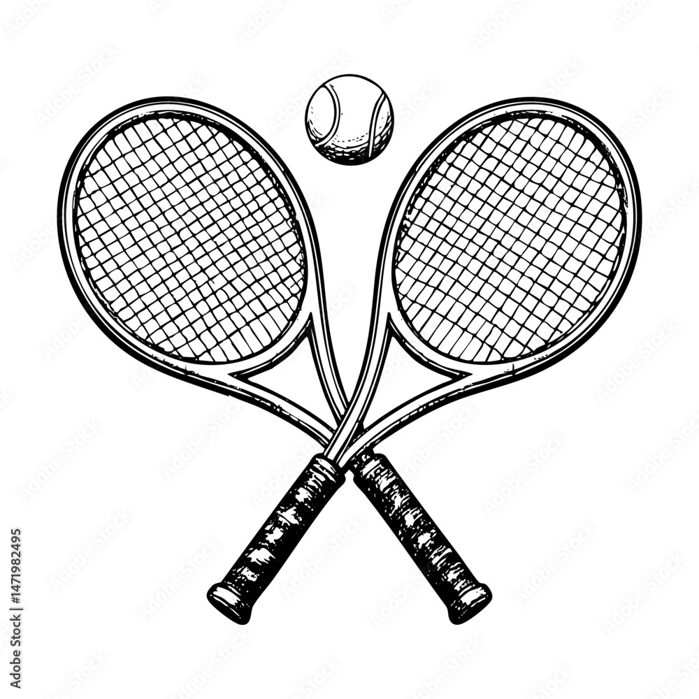 Tennis racket crossed sketch engraving black and white outline. Scratch board imitation. illustrated in vintage line art style on a white background. #1471982495