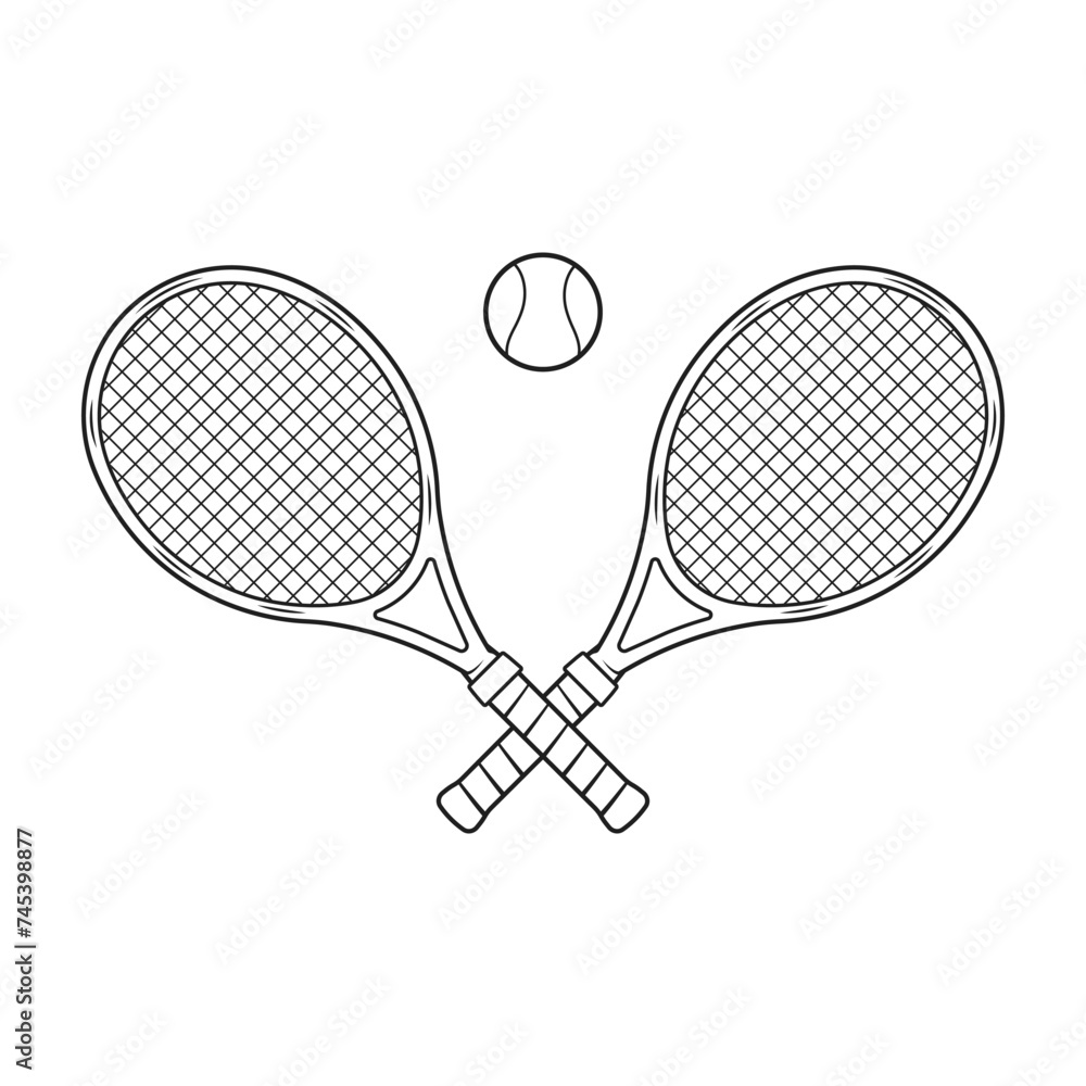 Tennis rackets and ball drawing, tennis logo, crossed tennis rackets, outläne vector illustration #745398877