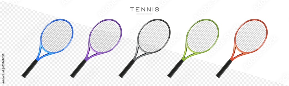 Tennis rackets vector realistic illustration. Sports equipment icons. Badminton rackets set in different colors #559656198