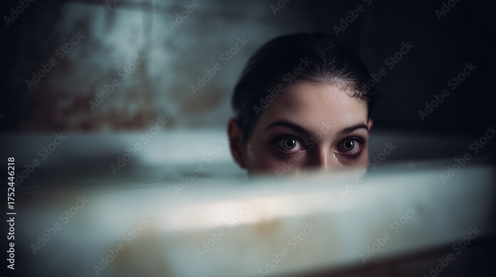 Terrifying ghostly woman with white eyes emerging from dirty bathtub, cinematic horror lighting, eerie bathroom scene, psychological thriller atmosphere, fine art horror photograph #1752446218