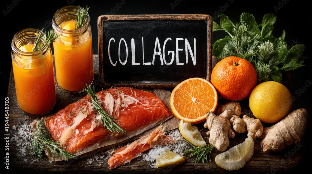 Text "COLLAGEN" written with chalk on a blackboard, surrounded by bone broth, salmon skin and citrus fruits #1944548703