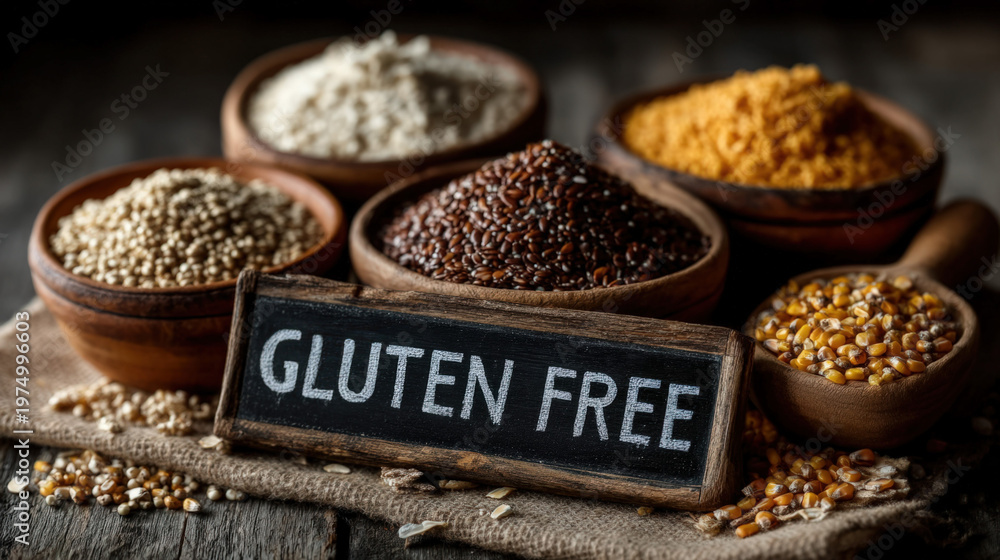 Text "GLUTEN FREE" on a chalkboard, surrounded by quinoa, rice cakes, buckwheat and corn #1974996603