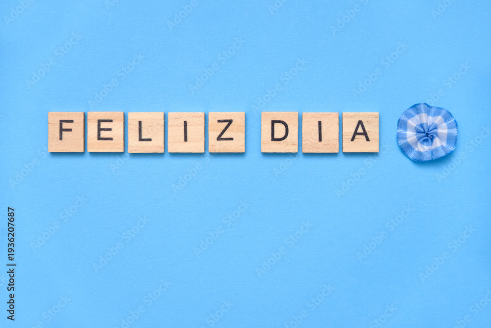 Text in Spanish Happy day and a cockade, escarapela, symbol of Argentine national identity that has the colors of the flag, light blue and white, and is used during national holidays celebrations #1936207687