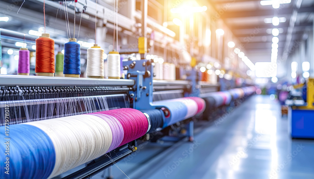 Textile manufacturing with colorful thread spools on weaving machines in bright industrial factory, showing detailed fabric production and modern equipment #1777978017