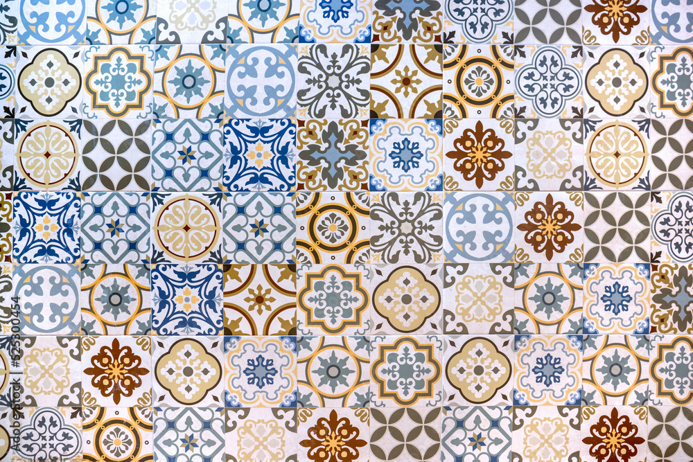Texture of hydraulic tiles. Floral and arabesque geometric patterns. Pattern concept. #525300454