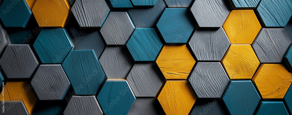 Textured hexagonal tiles in a repeating geometric pattern featuring wood grain textures in vibrant yellow teal and gray hues for a modern abstract background #1911445694