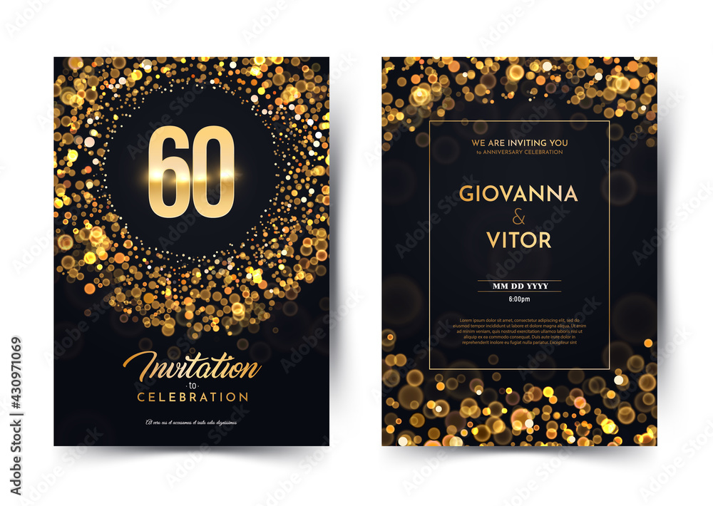 60th years birthday vector black paper luxury invitation double card. Sixty years wedding anniversary celebration brochure. Template of invitational for print dark background with bokeh lights #430971069